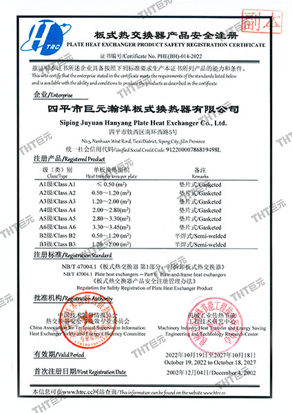 板式熱交換器產(chǎn)品安全注冊(cè)證